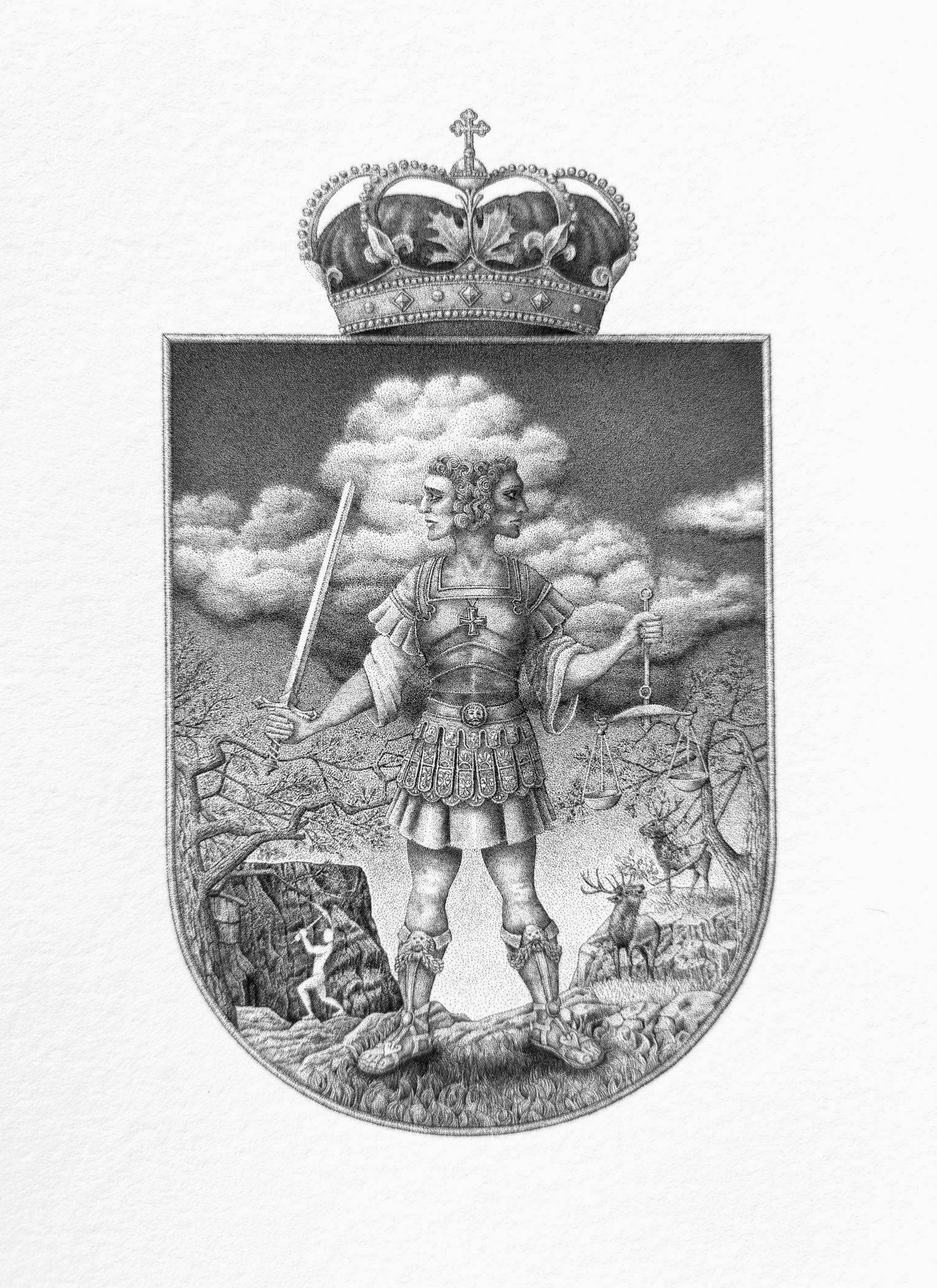 In one hand he brandishes a sword, in the other he balances a set of scales. Power and justice in equal measure – a balance some might still aspire to. His boots are adorned with tiny panther heads. No one quite knows why. But then again, why not?